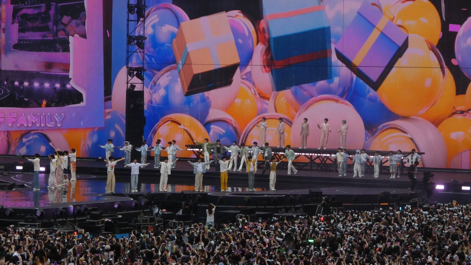 不同于成熟偶像的零失误表演,这场跨代音乐会上,“不完美”反而成了流量密码。余宇涵在《HeyMama》舞台耳麦突然失灵,他即兴增加的wave动作被网友截成动图疯传;聂玮辰穿着唯一一条拳击短裤跳《大舌头》的“显眼包”造型,让#全员穿长裤不告诉聂玮辰#话题单日阅读量破亿。这些在传统演唱会中会被视为事故的瞬间,在TF家族的粉丝语境里,却成了“鲜活感”的证明。正如超话热评所说:“我们追的不是完美偶像,是看着他们从跌跌撞撞长成参天大树的过程。”这种独特的粉丝文化,在三天演出中展现得淋漓尽致。当王橹杰与穆祉丞的《美杜莎》舞台因摸脸互动引发CP粉狂欢时,后排观众自发打开手机手电筒组成“银河应援”;张真源撒金粉的《月之浮想》舞台出现粉尘过敏咳嗽,镜头立刻切到台下粉丝举着“多喝水”灯牌的特写。更令人动容的是《宠爱》前奏响起时,从二代到五代成员集体冲台的瞬间,那些略显生疏却整齐划一的动作,让屏幕前的老粉忍不住泪目:“这哪里是肌肉记忆,分明是刻进DNA的团魂。”