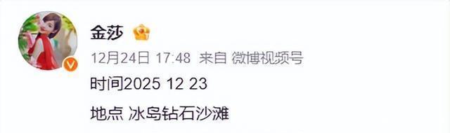 事后金莎也没有发什么煽情的长文,就简单地写了“时间:2025.12.23;地点:冰岛钻石沙滩;事件:求婚”,还附上了现场的视频。